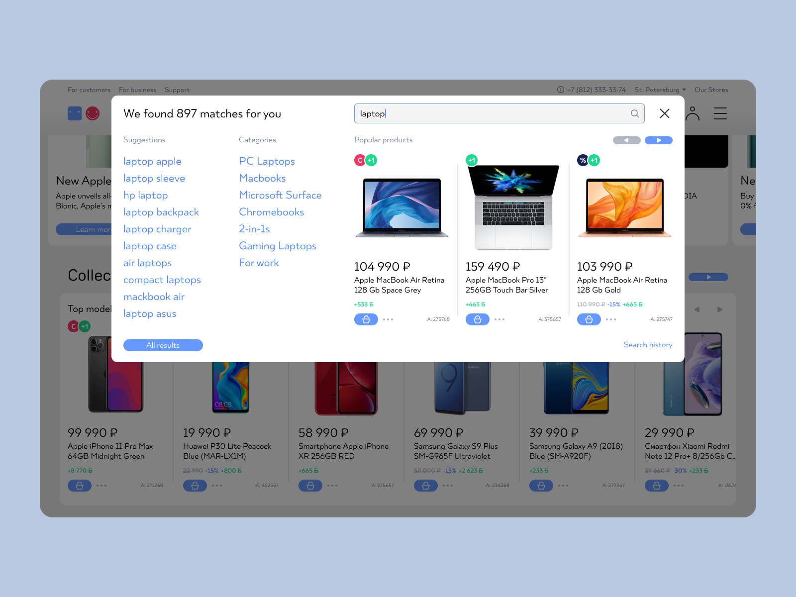 Key.ru, the largest electronics retailer in St. Petersburg, teamed up with agency for redesign of its online store. We had to do an in-depth study of the existing interface, formalize the needs of the business together with the client team and create new experience in interacting with a large e-catalog of products, company services, while preserving the familiar website structure for customers.