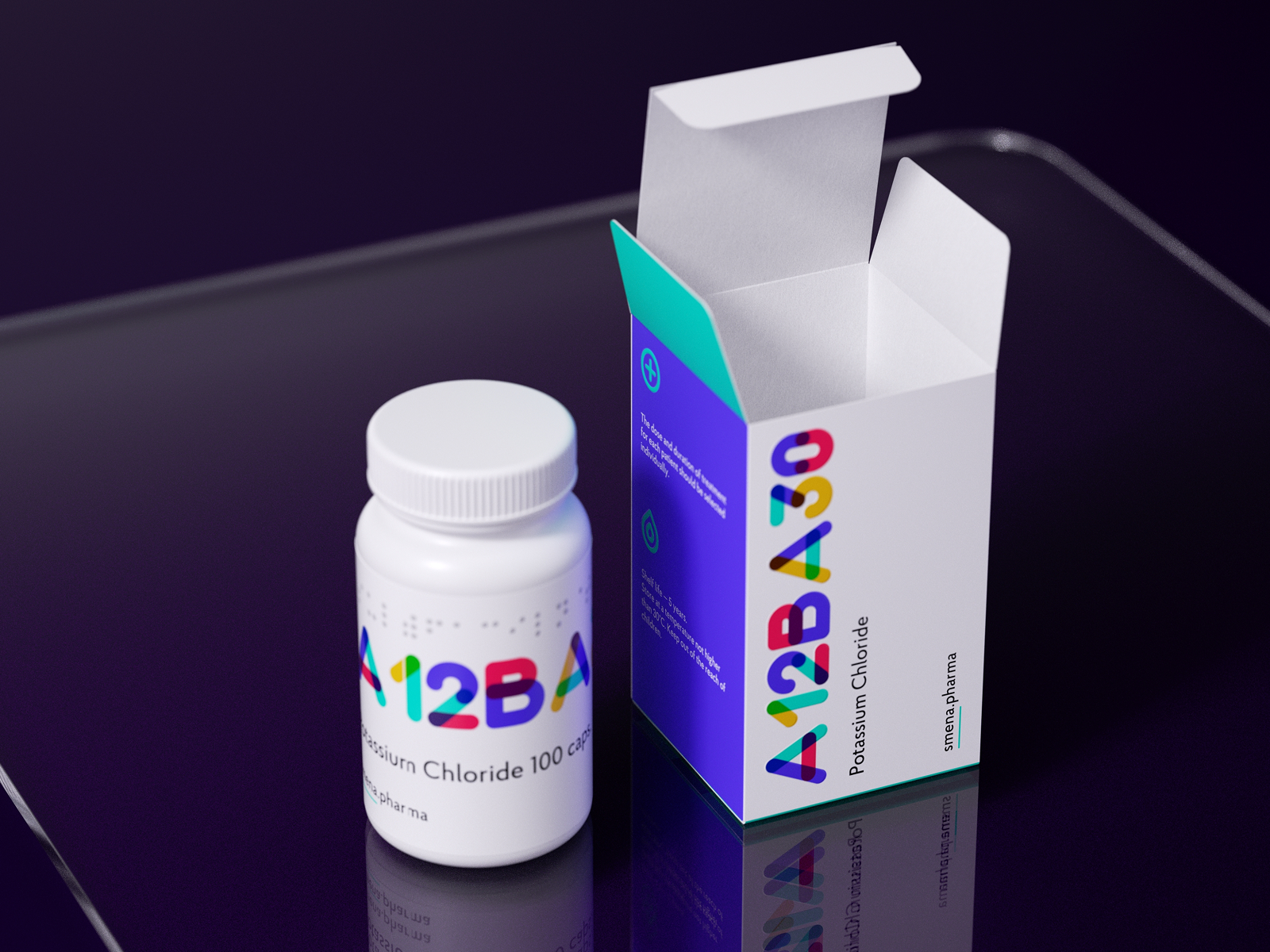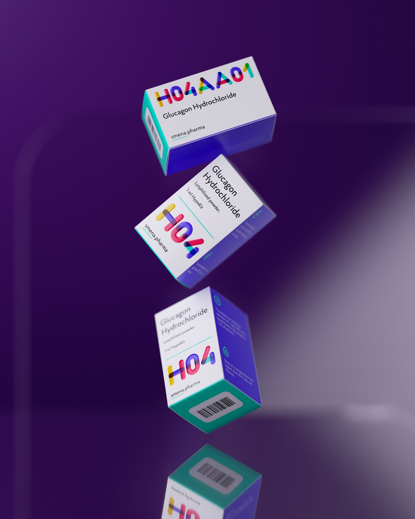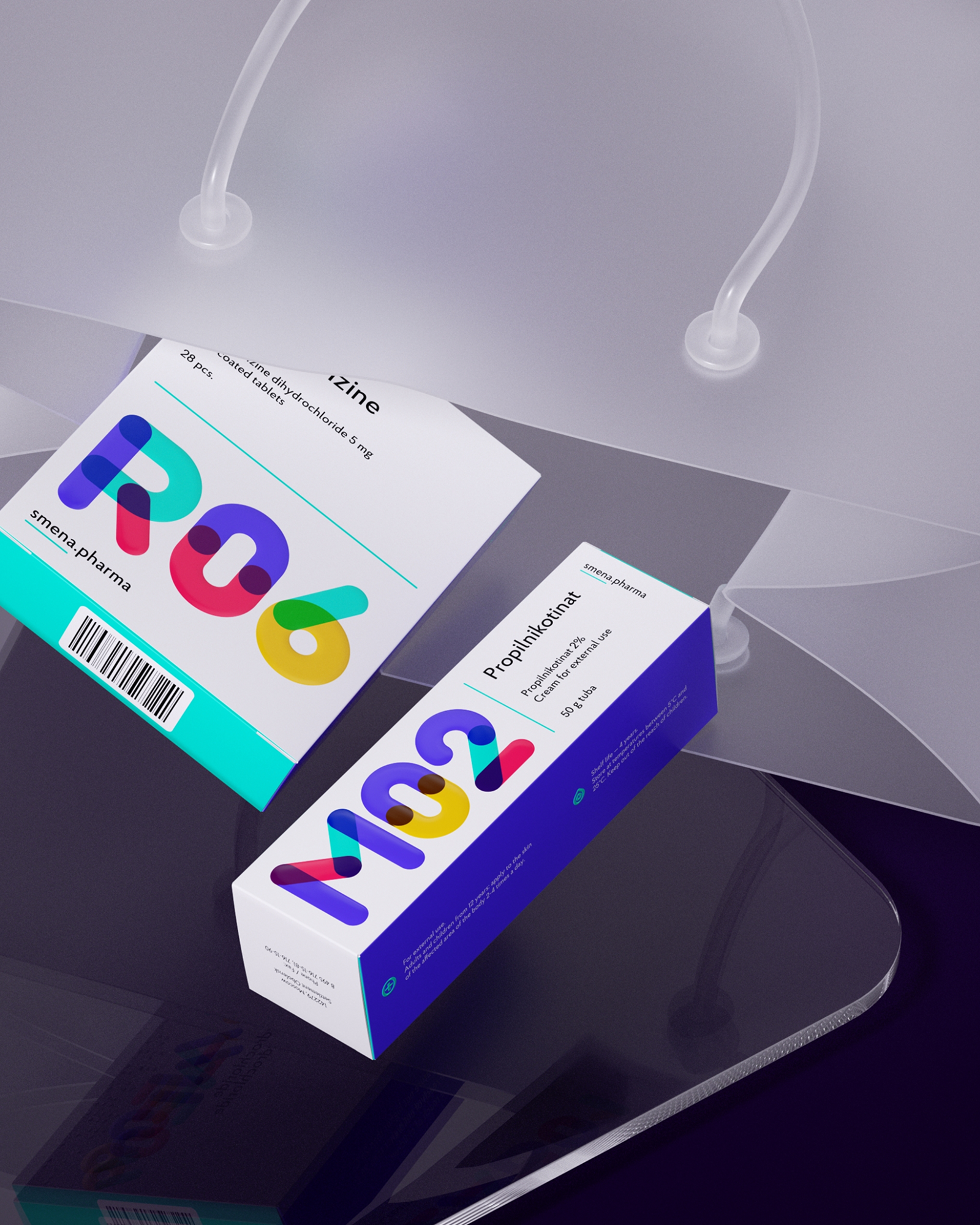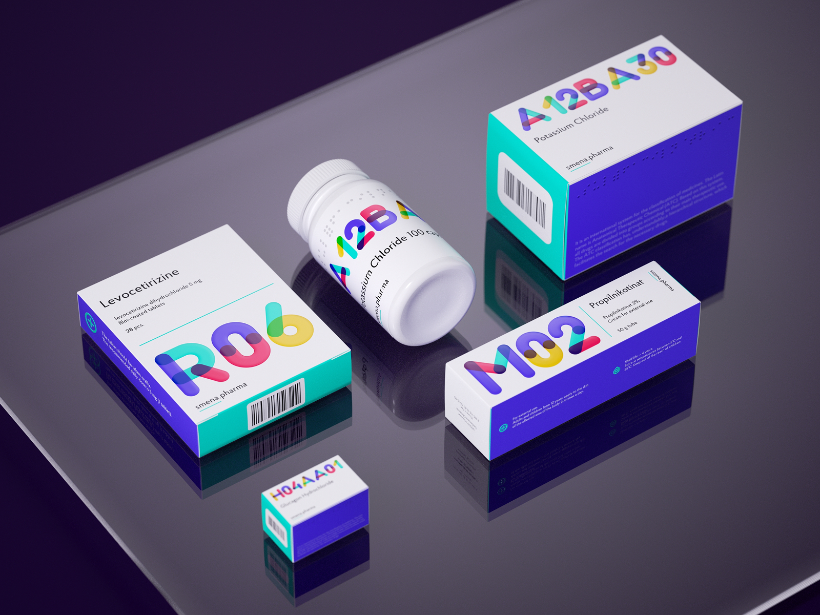 The basis of the identity for Smena is the custom display font we created, which is used to design the ATC code on the drug packaging. The code helps buyers quickly find the exact medicine they need. The idea to integrate the code classifier emerged during collaboration with the client’s specialists and later became a core element of the visual system we developed.