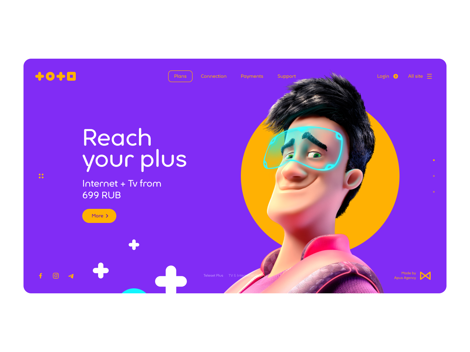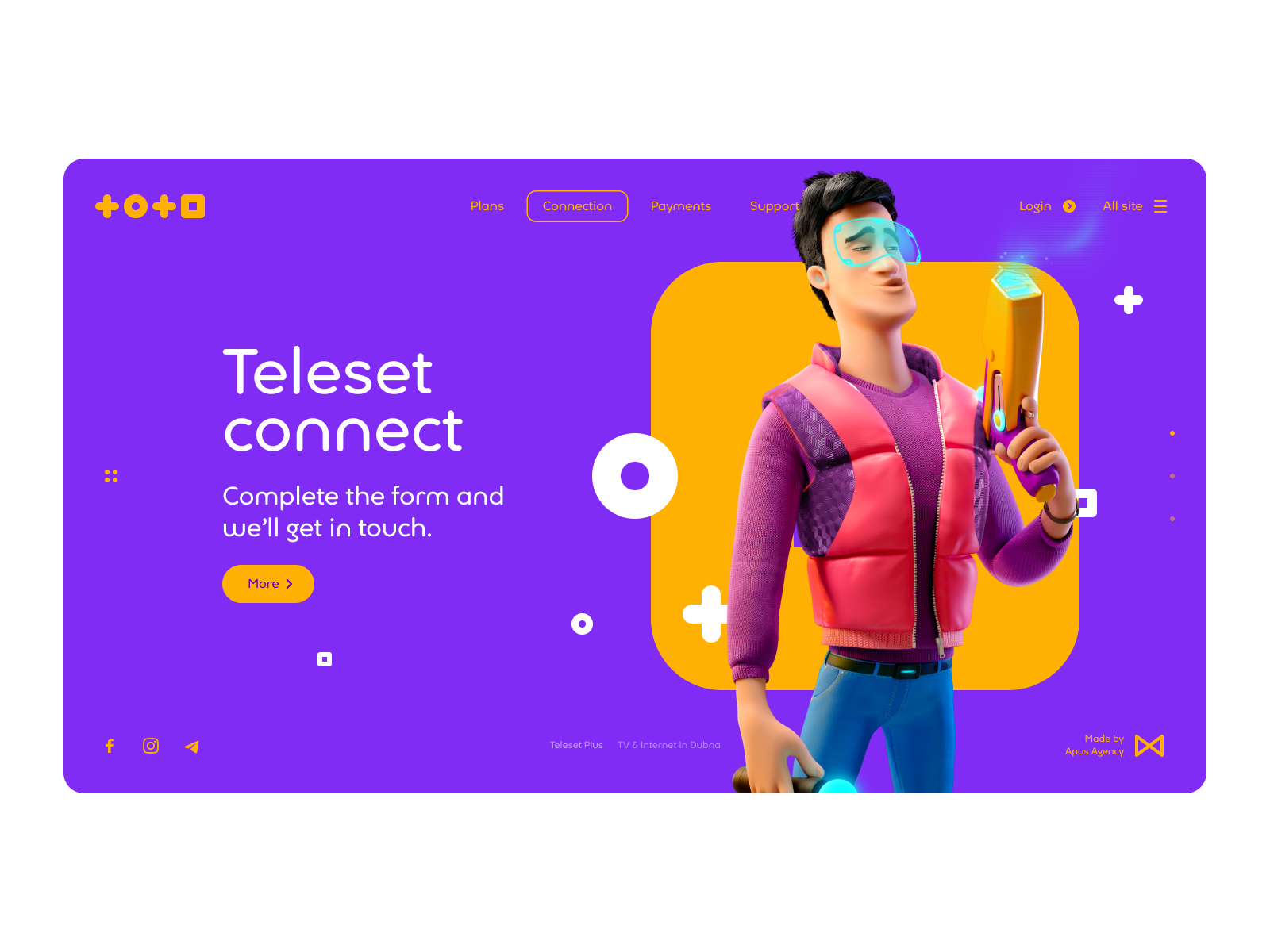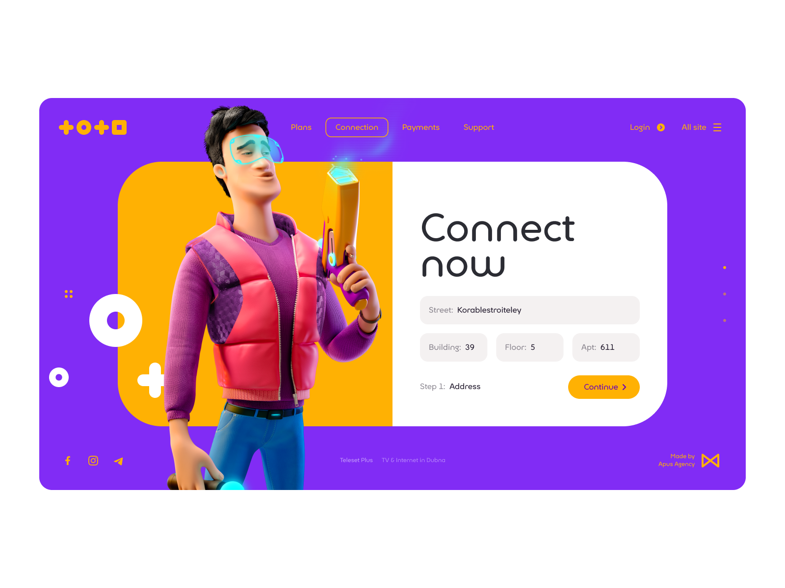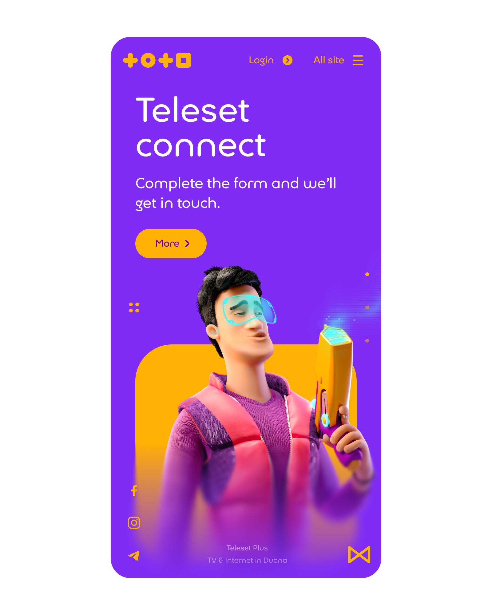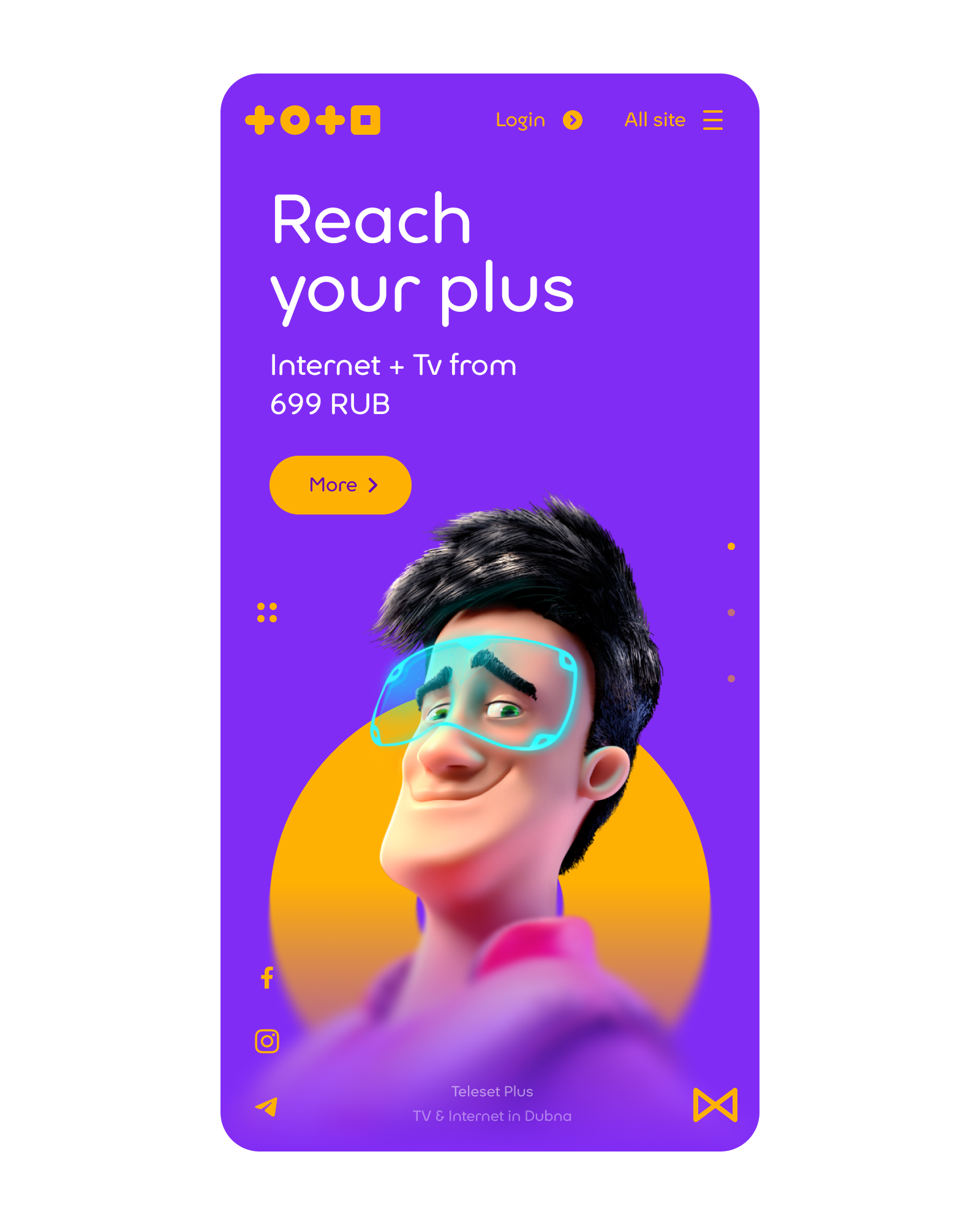 Teleset.plus is a regional telecommunications company in Dubna. The new website was developed as part of rebranding along with Apus↗ design team for the specific tasks of the Teleset.plus company, including the promotion of Internet + TV services. The new design of the website makes the processes of submitting a request to activate the service easier for users, featuring the main sections: pricing, activation, balance top-up and support.