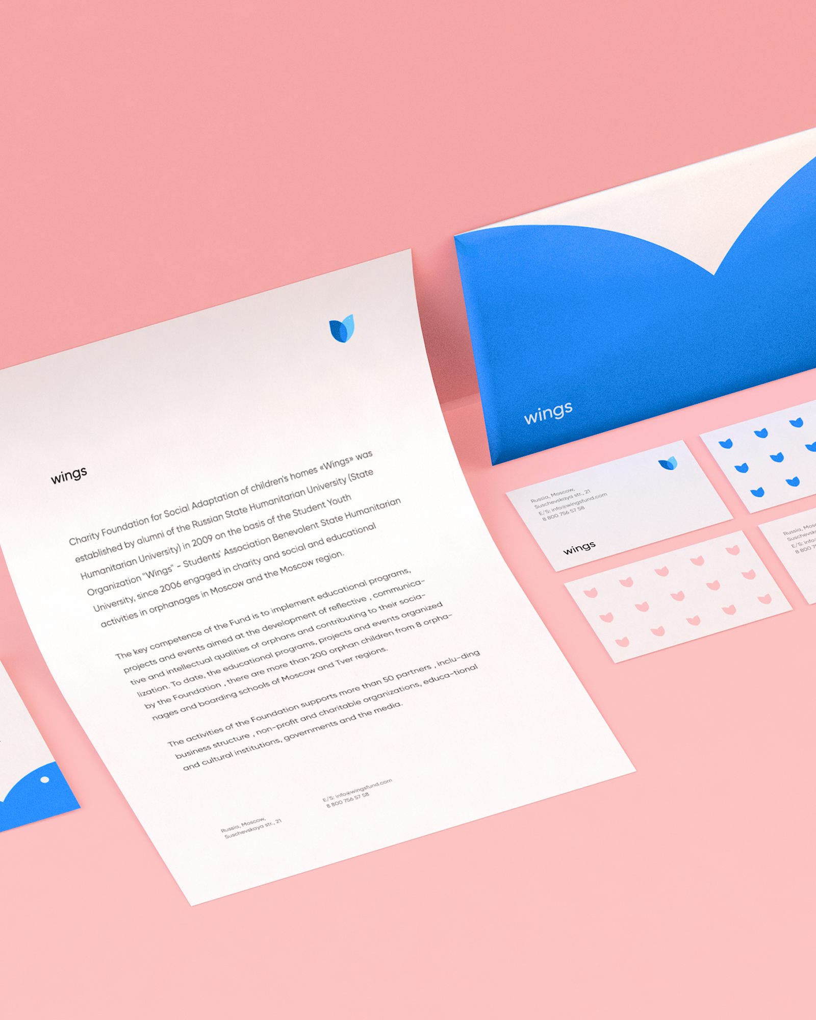 Charity fund Wings carries out educations and game projects, modelling real life situations and helping residents of orphanages to socially adapt after the graduation. Over 200 kids from 8 orphanages-boarding schools of Moscow and Tver regions participate in fund’s projects. The agency had a task to create a modern charity brand and its design identity to support and strengthen the image of the Fund and communication with outer and inner audience.